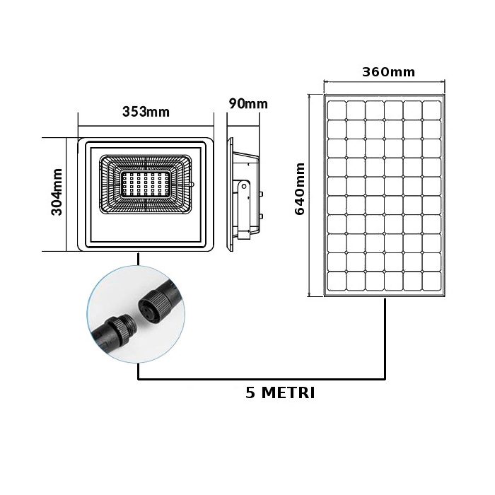 Dodávaný fotovoltaický panel má kábel s dĺžkou 5 metrov a prostredníctvom vodotesného konektora je pripojený k reflektoru, ktorý má internú batériu s napätím 3,2 V 5000 mAh, ktorú je možné nabíjať približne 4 hodiny a zaručuje tak autonómiu (prevádzku) približne 8 hodín. Diaľkové ovládanie sa dá navyše použiť na zapnutie a vypnutie svetla alebo na nastavenie troch rôznych časovačov: 3 hodiny, 5 hodín, 8 hodín. Tento kvalitný reflektor je vyrobený z hliníkového materiálu a má čierny farebný povrch.