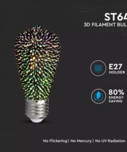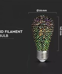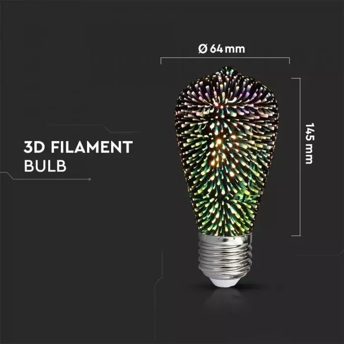 Kolekcia 3D FIREWORKS je kolekcia dekoračných žiaroviek, ktoré dokážu vytvoriť nádherné osvetlenie pre Vašu domácnosť, party, svadbu a podobne. Kolekcia dekoratívnych žiaroviek obsahuje 3D farebný efekt.Okrem toho sú tieto žiarovky šetrné k životnému prostrediu a chránia Vás pred UV alebo IR žiareniu. Žiarovky ponúkajú unikátny dizajn a poskytujú 3D efekt, efekt ohňostroja. Spestrite svoje osvetlenie v podniku alebo vo vašej domácnosti. S kolekciou žiaroviek 3D FIREWORKS bude Váš podnik bezkonkurenčný a nádherný.