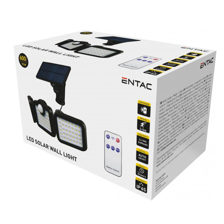 LED nástenné solárne svietidlo s odnímateľným solárnym panelom, 15W, IP65, 600lm , ideálne pre umiestnenie nad vchodové dvere, pre osvetlenie záhrady, jazierok, terasy alebo chodníkov. Svietidlo sa nabíja behom dňa a po zotmení sa automaticky zapne pri zachytení pohybu.