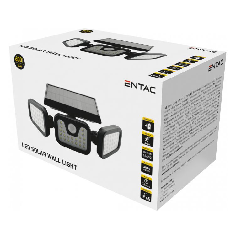 LED nástenné solárne svietidlo s pohybovým senzorom, 15W, IP65, 600lm, ideálne pre umiestnenie nad vchodové dvere, pre osvetlenie záhrady, jazierok, terasy alebo chodníkov. Svietidlo sa nabíja behom dňa a po zotmení sa automaticky zapne pri zachytení pohybu.