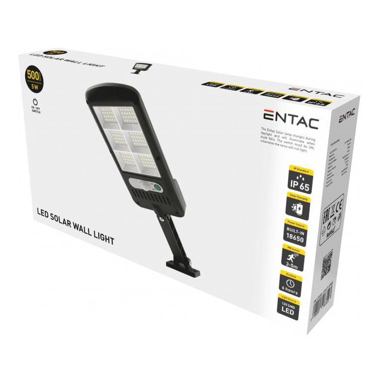 LED nástenné solárne svietidlo s pohybovým senzorom, 5W, IP65, 500lm, ideálne pre umiestnenie nad vchodové dvere, pre osvetlenie záhrady, jazierok, terasy alebo chodníkov. Svietidlo sa nabíja behom dňa a po zotmení sa automaticky zapne pri zachytení pohybu.