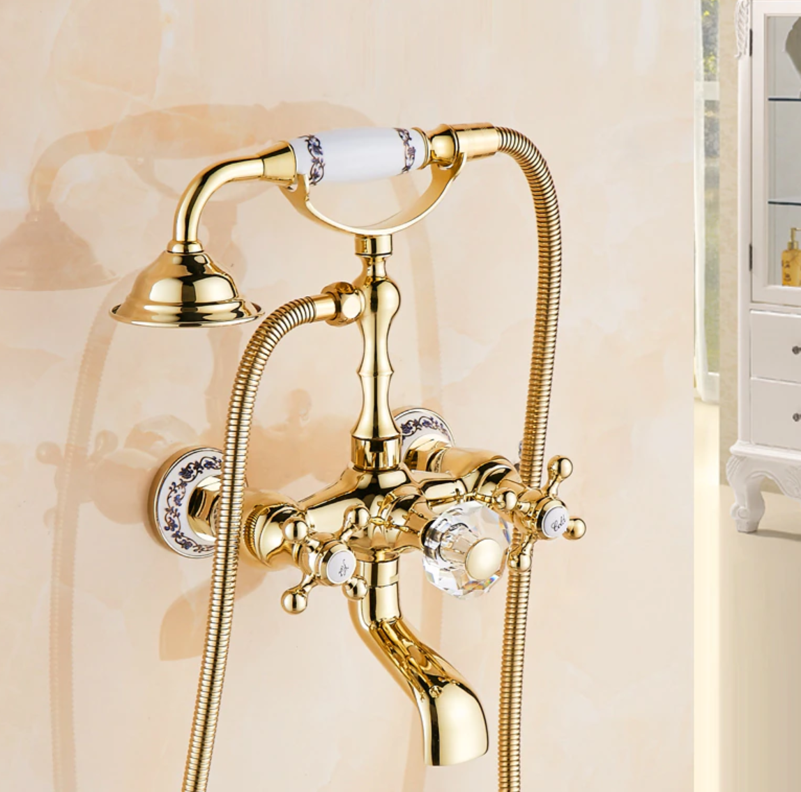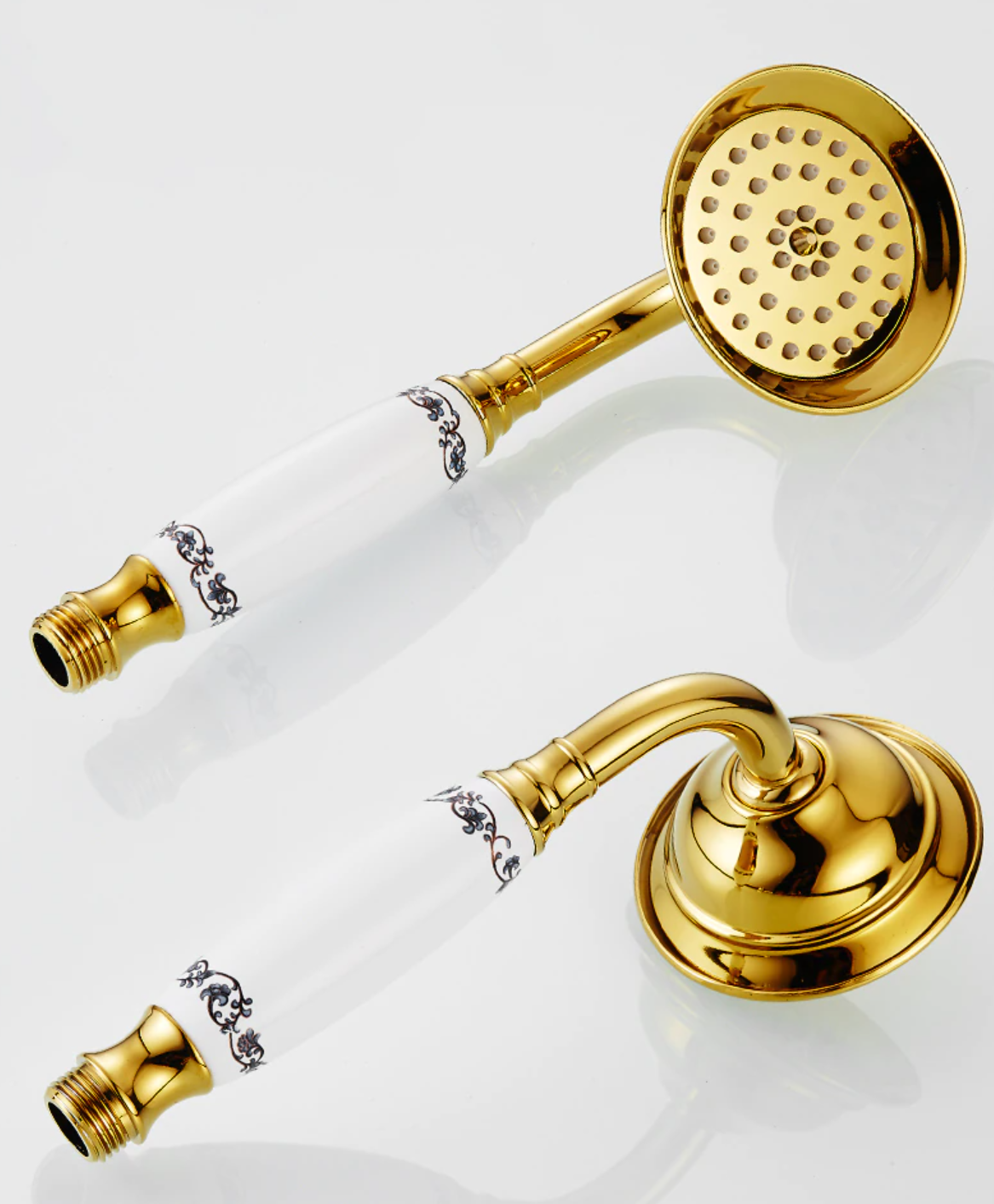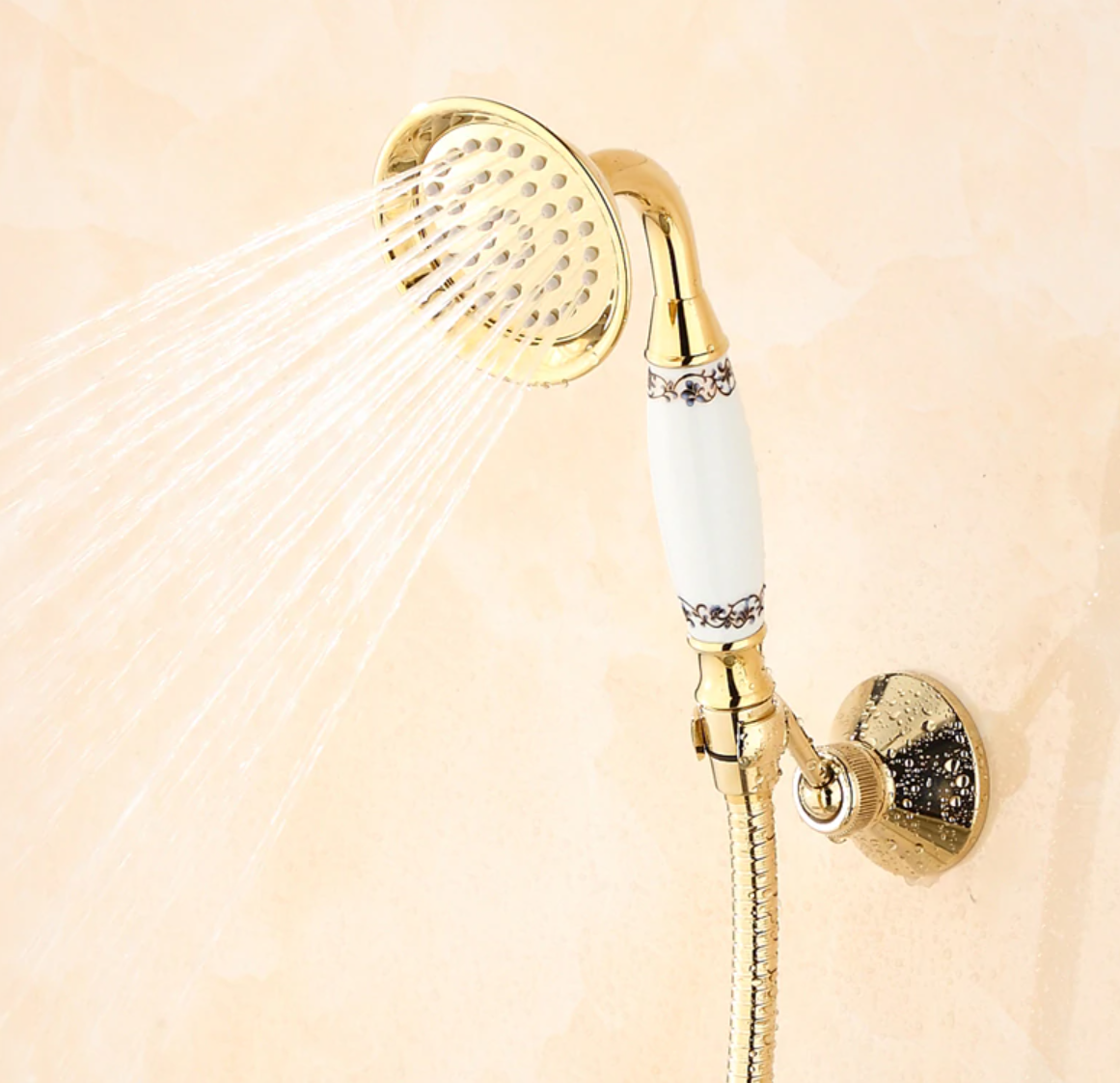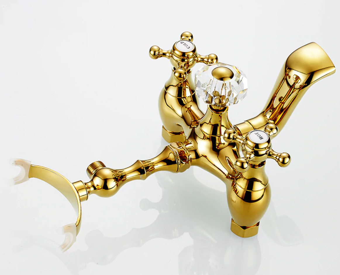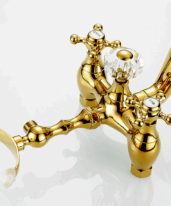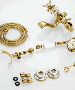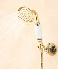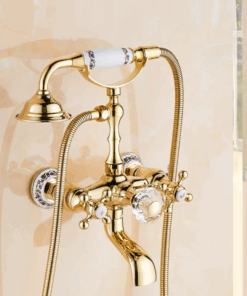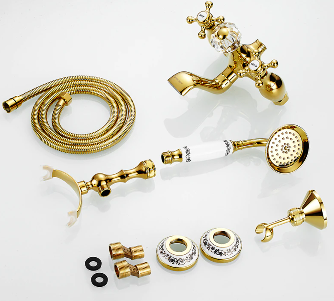 Prepracovaná vaňová batéria a sprcha v zlatej farbe s keramickým dekorom