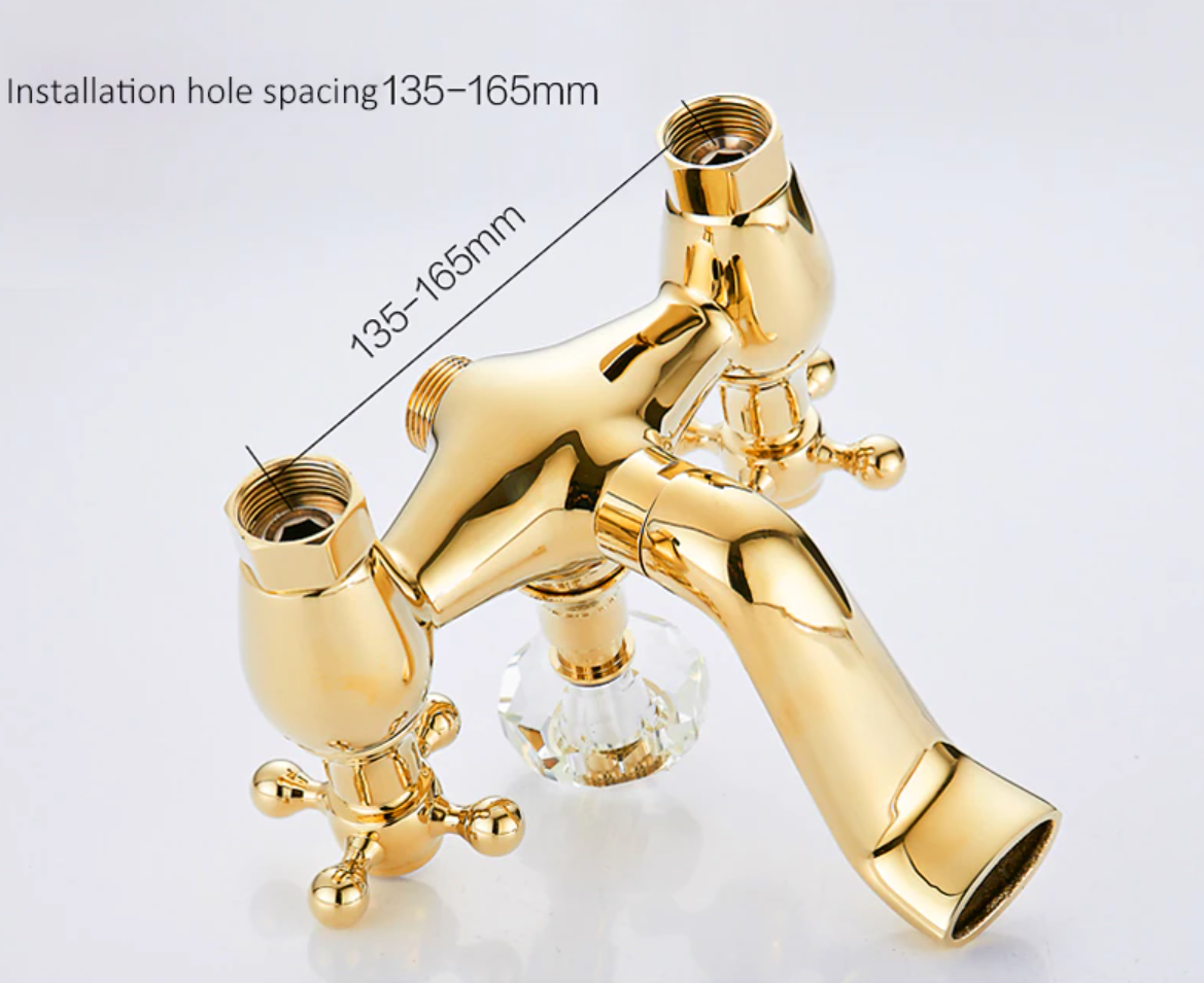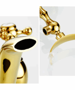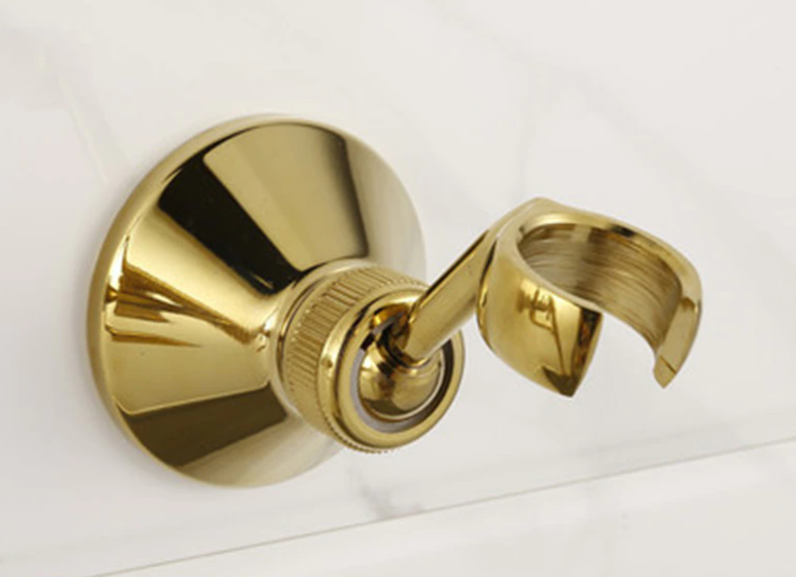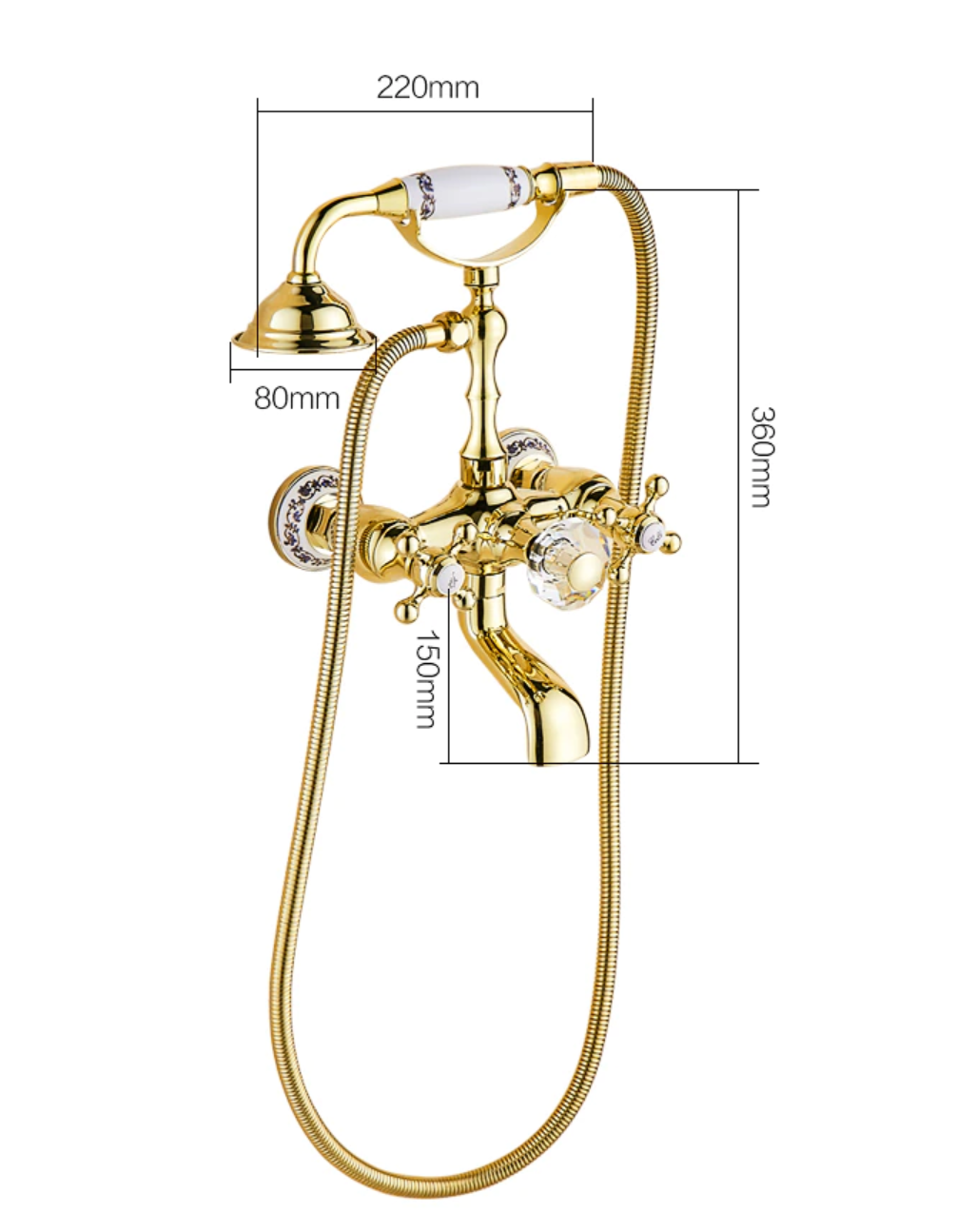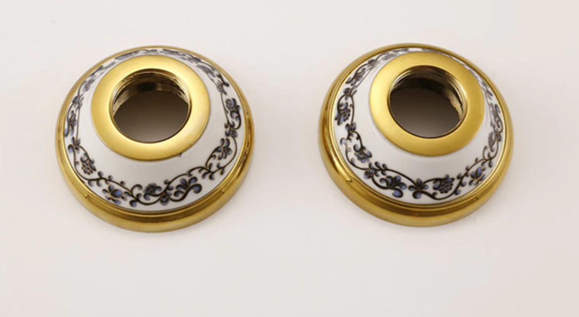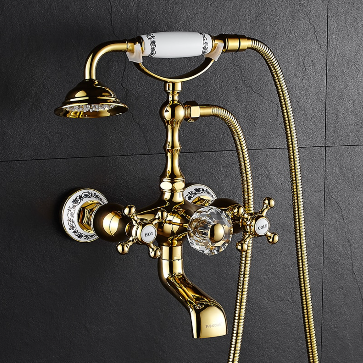 Prepracovaná vaňová batéria a sprcha v zlatej farbe s keramickým dekorom