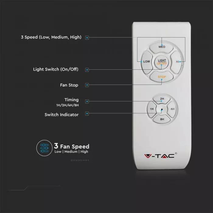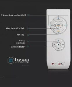 - Funkcia diaľkového ovládača: Svetlo ZAP / VYP – Teplota farby žiarovky – Rýchlosť vetrania – ZAP / VYP vetranie – Časovač vypnutia.