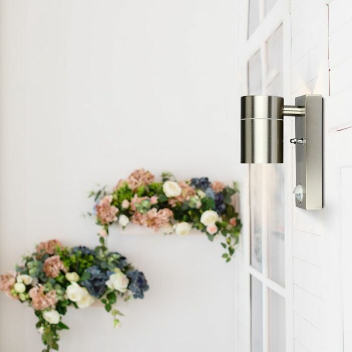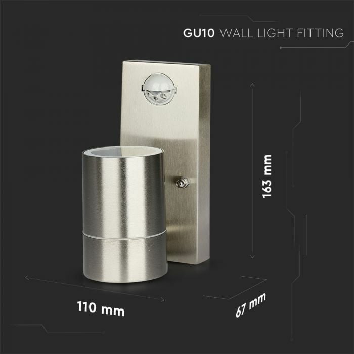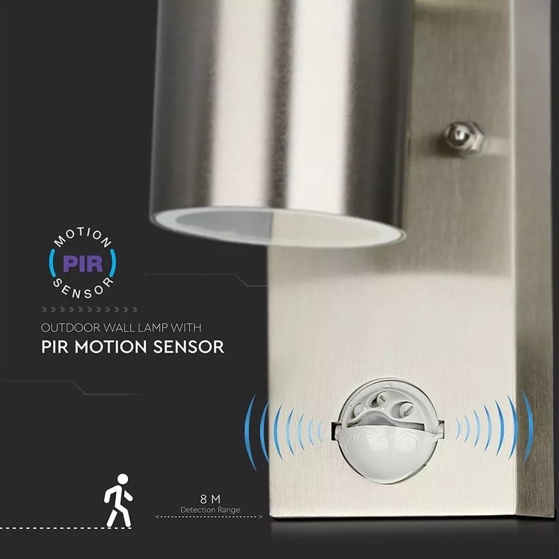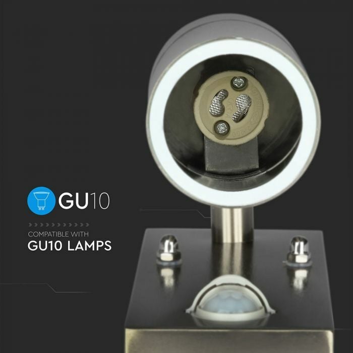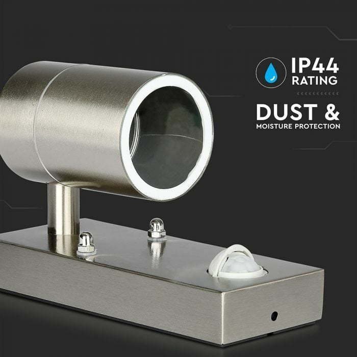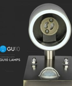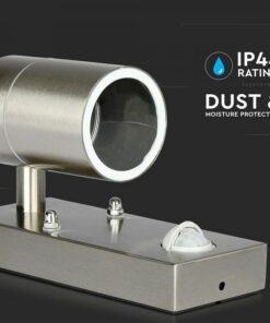 Záhradné nástenné svietidlo so senzorom 2 x GU10, IP44. Držiak lampy je vybavený snímačom pohybu a snímačom súmraku, ktoré umožňujú meniť dobu svietenia a intenzitu okolitého svetla.
